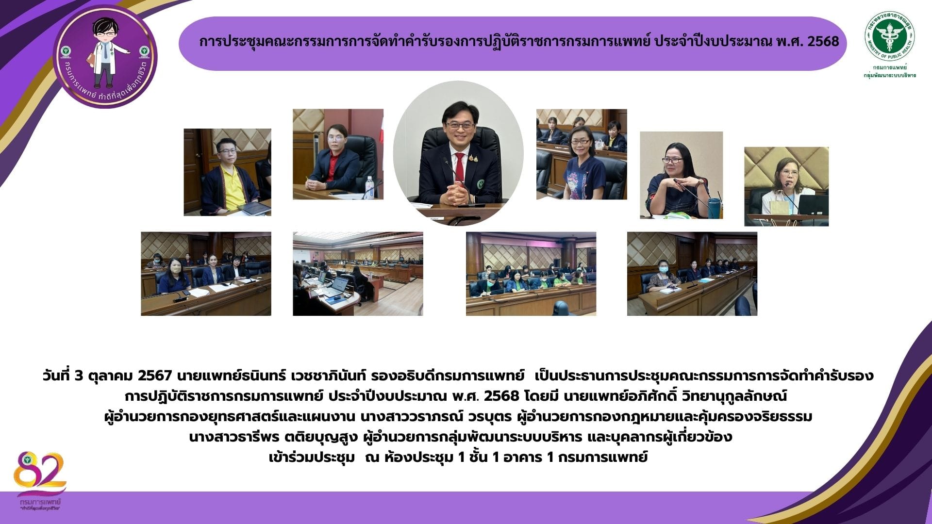 วันที่ 3 ตุลาคม 2567 นายแพทย์ธนินทร์ เวชชาภินันท์ รองอธิบดีกรมการแพทย์ เป็นประธานการประชุมคณะกรรมการการจัดทำคำรับรองการปฏิบัติราชการกรมการแพทย์ ประจำปีงบประมาณ พ.ศ. 2568 โดยมี นายแพทย์อภิศักดิ์ วิทยานุกูลลักษณ์ ผู้อำนวยการกองยุทธศาสตร์และแผนงาน นางสาววราภรณ์ วรบุตร ผู้อำนวยการกองกฎหมายและคุ้มครองจริยธรรม นางสาวธารีพร ตติยบุญสูง ผู้อำนวยการกลุ่มพัฒนาระบบบริหาร และบุคลากรผู้เกี่ยวข้อง เข้าร่วมประชุม ณ ห้องประชุม 1 ชั้น 1 อาคาร 1 กรมการแพทย์
