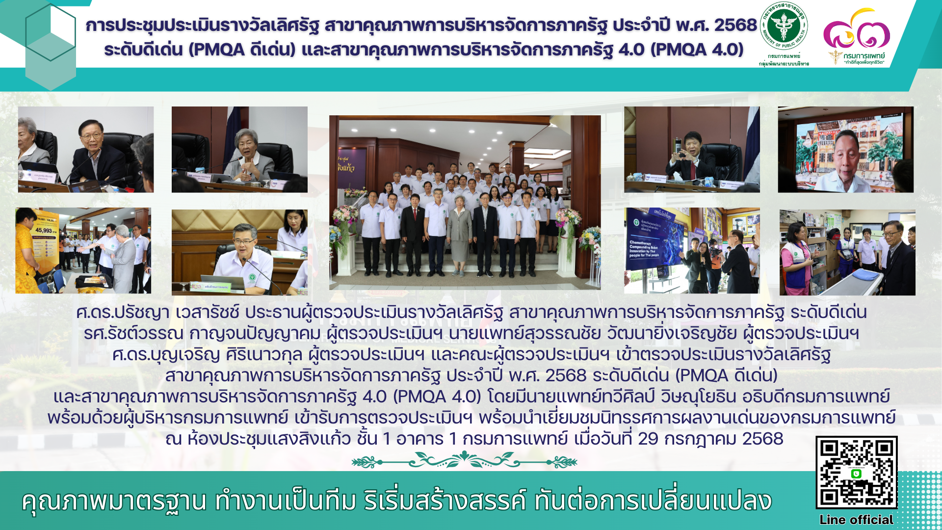 การประชุมประเมินรางวัลเลิศรัฐ สาขาคุณภาพการบริหารจัดการภาครัฐ ประจำปี พ.ศ. 2568 ระดับดีเด่น (PMQA ดีเด่น) และสาขาคุณภาพการบริหารจัดการภาครัฐ 4.0 (PMQA 4.0) 29 กรกฎาคม 202529 สิงหาคม 2025 PSD-DMS บทความ https://psd.dms-moph.com/wp-content/uploads/2025/08/video-รางวัลเลิศรัฐระดับดีเด่นและ-4.0.mp4 เมื่อวันที่ 29 กรกฎาคม 2568 ศ.ดร.ปรัชญา เวสารัชช์ ประธานผู้ตรวจประเมินรางวัลเลิศรัฐ สาขาคุณภาพการบริหารจัดการภาครัฐ ระดับดีเด่น รศ.รัชต์วรรณ กาญจนปัญญาคม ผู้ตรวจประเมินฯ นายแพทย์สุวรรณชัย วัฒนายิ่งเจริญชัย ผู้ตรวจประเมินฯ ศ.ดร.บุญเจริญ ศิริเนาวกุล ผู้ตรวจประเมินฯ และคณะผู้ตรวจประเมินฯเข้าตรวจประเมินรางวัลเลิศรัฐ สาขาคุณภาพการบริหารจัดการภาครัฐประจำปี พ.ศ. 2568 ระดับดีเด่น (PMQA ดีเด่น)และสาขาคุณภาพการบริหารจัดการภาครัฐ 4.0 (PMQA 4.0) โดยมีนายแพทย์ทวีศิลป์ วิษณุโยธิน อธิบดีกรมการแพทย์ พร้อมด้วยผู้บริหารกรมการแพทย์เข้ารับการตรวจประเมินฯ พร้อมนำเยี่ยมชมนิทรรศการผลงานเด่นของกรมการแพทย์ ณ ห้องประชุมแสงสิงแก้ว ชั้น 1 อาคาร 1 กรมการแพทย์ 183 ปี 2568 PSD-DMS ธีมเวิร์ดเพรสเอนกประสงค์ เหมาะสำหรับผู้ใช้ทั่วไป ไม่จำเป็นต้องเขียนโค้ด ก็สามารถสร้าง บล็อก, เว็บไซต์องค์กร, เว็บอีคอมเมิร์ซได้