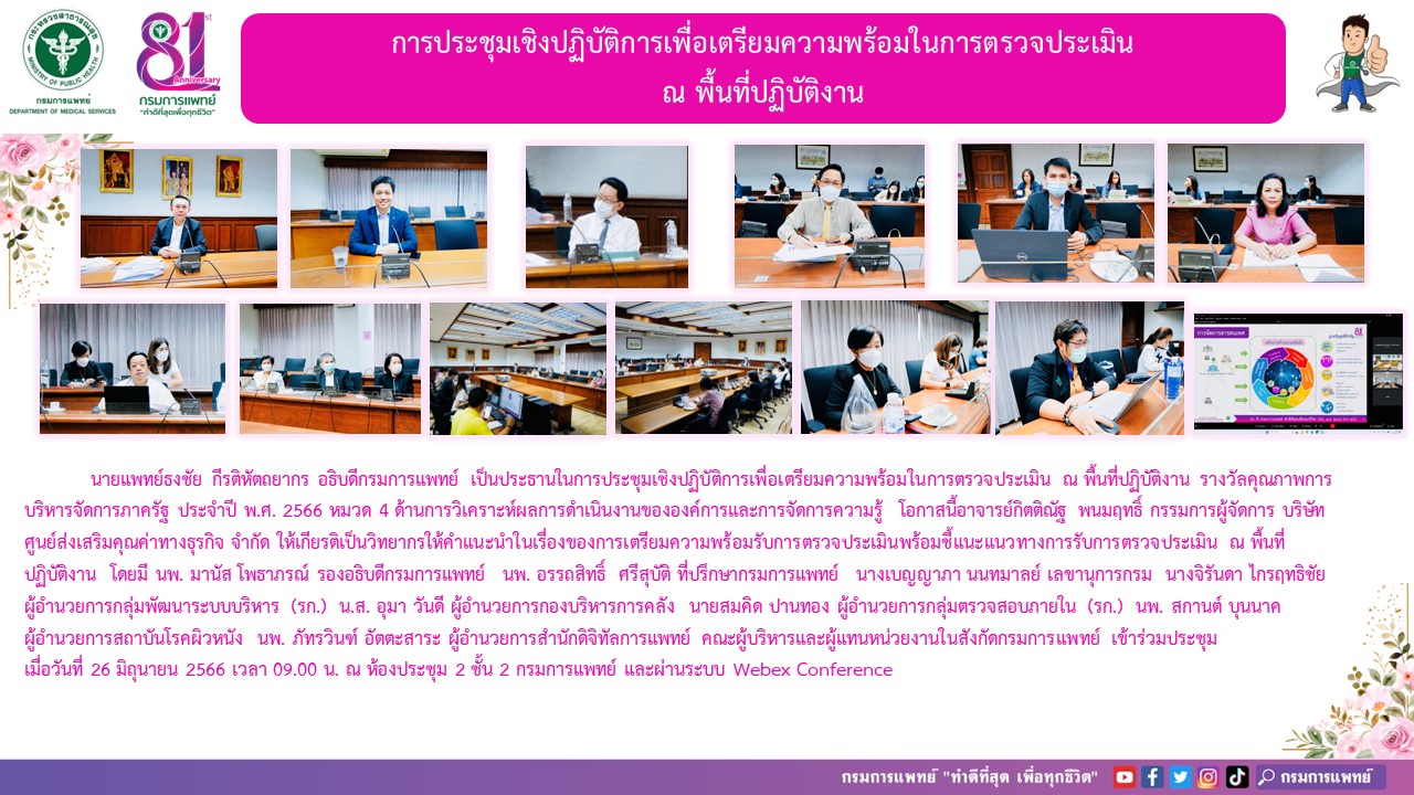 นายแพทย์ธงชัย กีรติหัตถยากร อธิบดีกรมการแพทย์ เป็นประธานในการประชุมเชิงปฏิบัติการเพื่อเตรียมความพร้อมในการตรวจประเมิน ณ พื้นที่ปฏิบัติงาน รางวัลคุณภาพการบริหารจัดการภาครัฐ ประจำปี พ.ศ. 2566 หมวด 4 ด้านการวิเคราะห์ผลการดำเนินงานขององค์การและการจัดการความรู้ โอกาสนี้อาจารย์กิตติณัฐ พนมฤทธิ์ กรรมการผู้จัดการ บริษัท ศูนย์ส่งเสริมคุณค่าทางธุรกิจ จำกัด ให้เกียรติเป็นวิทยากรให้คำแนะนำในเรื่องของการเตรียมความพร้อมรับการตรวจประเมินพร้อมชี้แนะแนวทางการรับการตรวจประเมิน ณ พื้นที่ปฏิบัติงาน โดยมี นพ. มานัส โพธาภรณ์ รองอธิบดีกรมการแพทย์ นพ. อรรถสิทธิ์ ศรีสุบัติ ที่ปรึกษากรมการแพทย์ นางเบญญาภา นนทมาลย์ เลขานุการกรม นางจิรันดา ไกรฤทธิชัย ผู้อำนวยการกลุ่มพัฒนาระบบบริหาร (รก.) น.ส. อุมา วันดี ผู้อำนวยการกองบริหารการคลัง นายสมคิด ปานทอง ผู้อำนวยการกลุ่มตรวจสอบภายใน (รก.) นพ. สกานต์ บุนนาค ผู้อำนวยการสถาบันโรคผิวหนัง นพ. ภัทรวินฑ์ อัตตะสาระ ผู้อำนวยการสำนักดิจิทัลการแพทย์ คณะผู้บริหารและผู้แทนหน่วยงานในสังกัดกรมการแพทย์ เข้าร่วมประชุม เมื่อวันที่ 26 มิถุนายน 2566 เวลา 09.00 น. ณ ห้องประชุม 2 ชั้น 2 กรมการแพทย์ และผ่านระบบ Webex Conference
