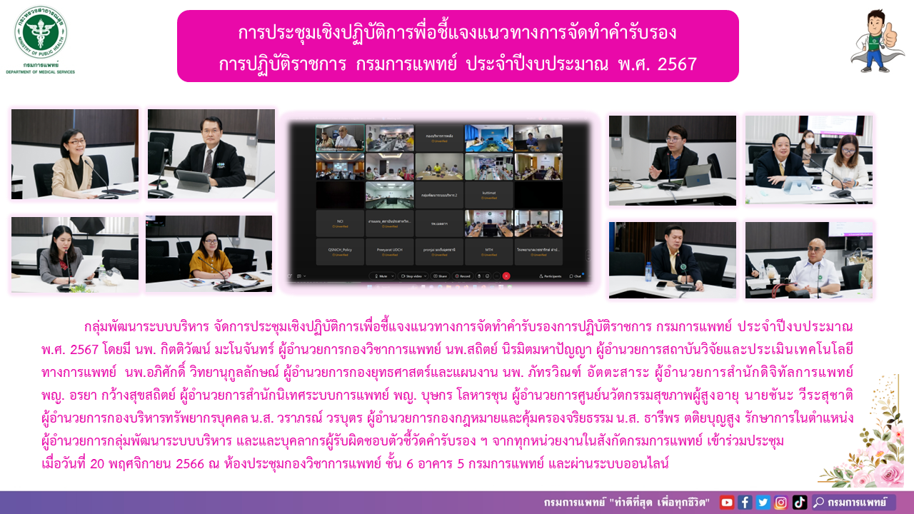 กลุ่มพัฒนาระบบบริหาร จัดการประชุมเชิงปฏิบัติการเพื่อชี้แจงแนวทางการจัดทำคำรับรองการปฏิบัติราชการ กรมการแพทย์ ประจำปีงบประมาณ พ.ศ. 2567 โดยมี นพ. กิตติวัฒน์ มะโนจันทร์ ผู้อำนวยการกองวิชาการแพทย์ นพ.สถิตย์ นิรมิตมหาปัญญา ผู้อำนวยการสถาบันวิจัยและประเมินเทคโนโลยีทางการแพทย์ นพ.อภิศักดิ์ วิทยานุกูลลักษณ์ ผู้อำนวยการกองยุทธศาสตร์และแผนงาน นพ. ภัทรวิณฑ์ อัตตะสาระ ผู้อำนวยการสำนักดิจิทัลการแพทย์ พญ. อรยา กว้างสุขสถิตย์ ผู้อำนวยการสำนักนิเทศระบบการแพทย์ พญ. บุษกร โลหารชุน ผู้อำนวยการศูนย์นวัตกรรมสุขภาพผู้สูงอายุ นายชันะ วีระสุชาติ ผู้อำนวยการกองบริหารทรัพยากรบุคคล น.ส. วราภรณ์ วรบุตร ผู้อำนวยการกองกฎหมายและคุ้มครองจริยธรรม น.ส. ธารีพร ตติยบุญสูง รักษาการในตำแหน่งผู้อำนวยการกลุ่มพัฒนาระบบบริหาร และและบุคลากรผู้รับผิดชอบตัวชี้วัดคำรับรอง ฯ จากทุกหน่วยงานในสังกัดกรมการแพทย์ เข้าร่วมประชุม เมื่อวันที่ 20 พฤศจิกายน 2566 ณ ห้องประชุมกองวิชาการแพทย์ ชั้น 6 อาคาร 5 กรมการแพทย์ และผ่านระบบออนไลน์