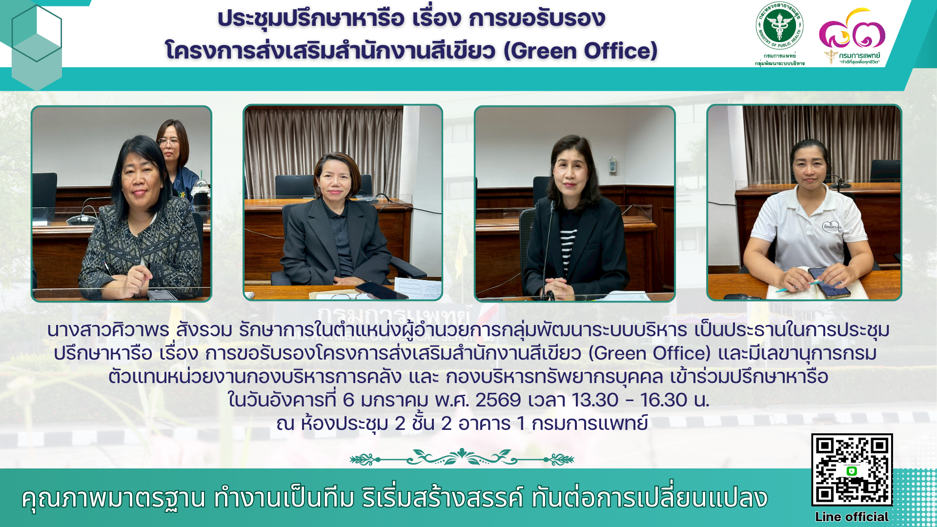 นางสาวศิวาพร สังรวม รักษาการในตำแหน่งผู้อำนวยการกลุ่มพัฒนาระบบบริหาร เป็นประธานในการประชุมปรึกษาหารือ เรื่อง การขอรับรองโครงการส่งเสริมสำนักงานสีเขียว (Green Office) และมีเลขานุการกรม ตัวแทนหน่วยงานกองบริหารการคลัง และ กองบริหารทรัพยากรบุคคล เข้าร่วมปรึกษาหารือ เมื่อวันอังคารที่ 6 มกราคม 2568 เวลา 13.30 – 16.30 น.